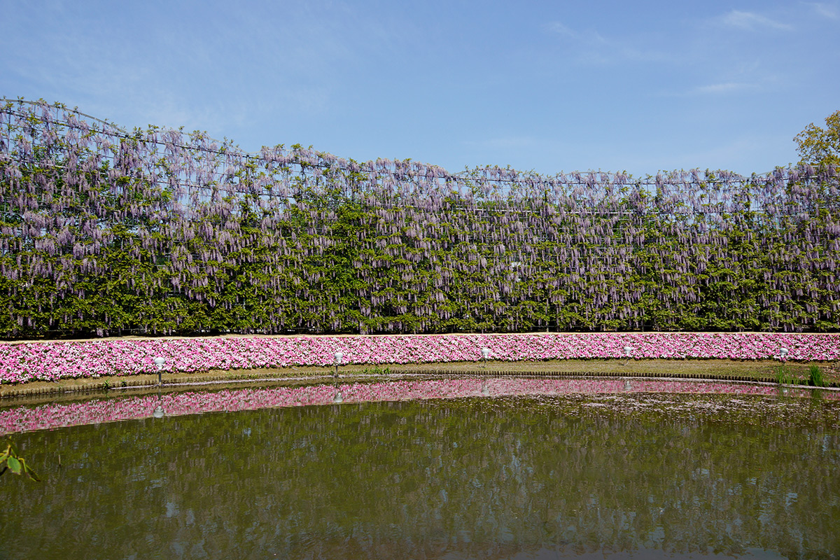 メインの大藤を始めむらさき藤やうす紅藤は見頃を迎えていました。樹齢150年、広さ1,000uの藤棚は2本の大藤が合体して出来た物で見事です。単体で咲いている白藤は見頃になってる所が多かったのですが、トンネルや滝はあと一歩という感じです。きばな藤に至ってはまったくという状況です。ツツジ咲いていましたが、既に萎れている花が多くありました。