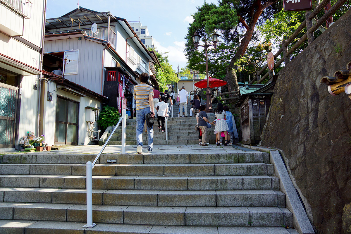 | 伊香保温泉では、2010年に石段を新設して現在は下の広場から上の伊香保神社まで365段あり、千明仁泉亭は丁度中間付近に位置しています。折角なので一旦下の広場まで降りて登り直す事にしました。365段と聞くとそれ程多くない様に感じますが、実際に登ってみると思った以上に足に来ます。私以外の家族は下へ降りなかったので、追い付こうと急いで登った事が更にきつさを増した原因でした。土曜日の石段街は流石に人手は多いです。 | ||