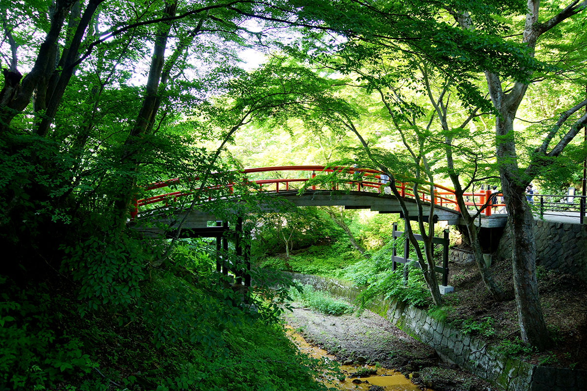 | 伊香保神社の奥へ400m程進むと河鹿橋という朱塗りの橋があります。ここは紅葉で有名な場所で、シーズン中はライトアップされとても綺麗らしいです。実際道路や橋はモミジに覆われていて、これが全て赤くなると圧巻の景色になると思われます。紅葉時期に一度は来てみたいと思っています。 | ||