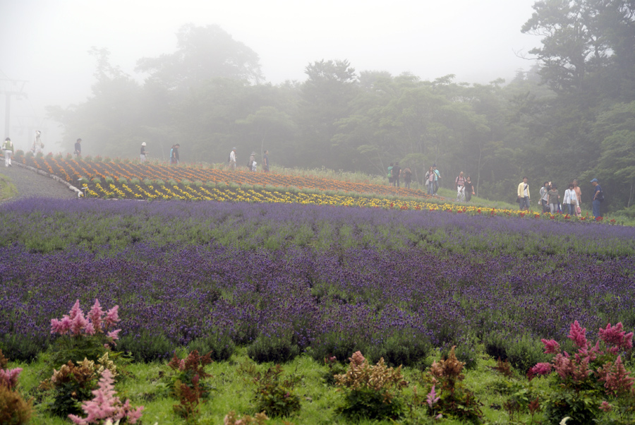 玉原ラベンダーパークは今回で2回目です。前回は子供が小学生の頃、夏休みに入ってすぐだったのでまだ早かったと記憶しています。 この日の天気予報は曇り、本当は晴れの日に行きたかったのですが、スケジュールの関係でこの日しかありませんでした。太田薮塚ICから沼田ICまで高速を走ります。高速の渋川から沼田周辺にかけては霧でこの先が心配になります。沼田ICで降りる頃には霧も晴れ明るくなり始めてきました。ここからラベンダーパークまでは一般道を約19Kmと意外とあります。 到着した時は霧が上の方に少しかかっていて程度で、花は綺麗に見えていました。入口に入るとサルビアやマリーゴールドが綺麗に咲く彩の丘があります。ここから上のラベンダー畑まではリフトでも行けますが、遊歩道でのんびり歩いて行くことにします。遊歩道の上に行くに従って徐々に霧が濃くなってきて、ラベンダー畑に着く頃には視界が悪いときには50m程度しかありませんでした。霧は中々晴れず「ブナの鐘」や「大展望台」へ行っても周りの景色はほとんど見えません。その後「虹の畑」の上の方に行ったときに少し霧が少なくなり、下の方に来た時には綺麗に咲き揃ったラベンダーを見ることが出来ました。でもこの後も霧は出たり無くなったりを繰り返していました。 レストハウス前の売店には名物の釜焼ピザやたんばらバーガーを売っています。 直径は13〜4cm位あったでしょうか。香ばしく厚みのあるパンに豚肉のパテや野菜、ベーコン等をはさみタルタルソースで味付けています。とても美味しくボリュームがあり、1つ食べると満足できます。1つ550円、是非どうぞ。 少し休んだ後、下まで歩いて戻りましたが霧はまだ少しかかっています。最後にラベンダーソフトクリームを食べて、玉原ラベンダーパークを後にします。 帰る途中の道から少し山に入ったところに、天狗のお面で有名な迦葉山弥勒寺があります。中峰堂には昭和14(1939)年に作られた顔の丈が6.5m鼻の高さが2.8mという日本一の大天狗面と、昭和46(1970)年に作られた顔の丈が5.5m鼻の高さが2.7mの面が安置されています。 | ||||||