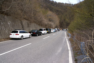 | 【ひとこと】 この山は、道路のすぐ脇に登山口がある。山頂まで意外と短時間で登る事が出来る。山頂での展望が良い。などの理由で登山者が多いのでしょうか。まあ、この日はGWだったからなのかも知れませんが、車の数は多かったです。おおまかに数えてみた所、総数で70台以上、その内路上駐車が30台前後でした。遠くの駐車スペースから歩くのは大変かもしれませんが、これだけ交通量があるところでの路上駐車は控えた方がいいと思います。本当に山の中で、交通量が少なければ仕方ないかも知れませんけどね。勝手な言い分ですが! | |