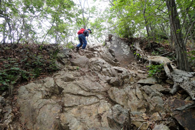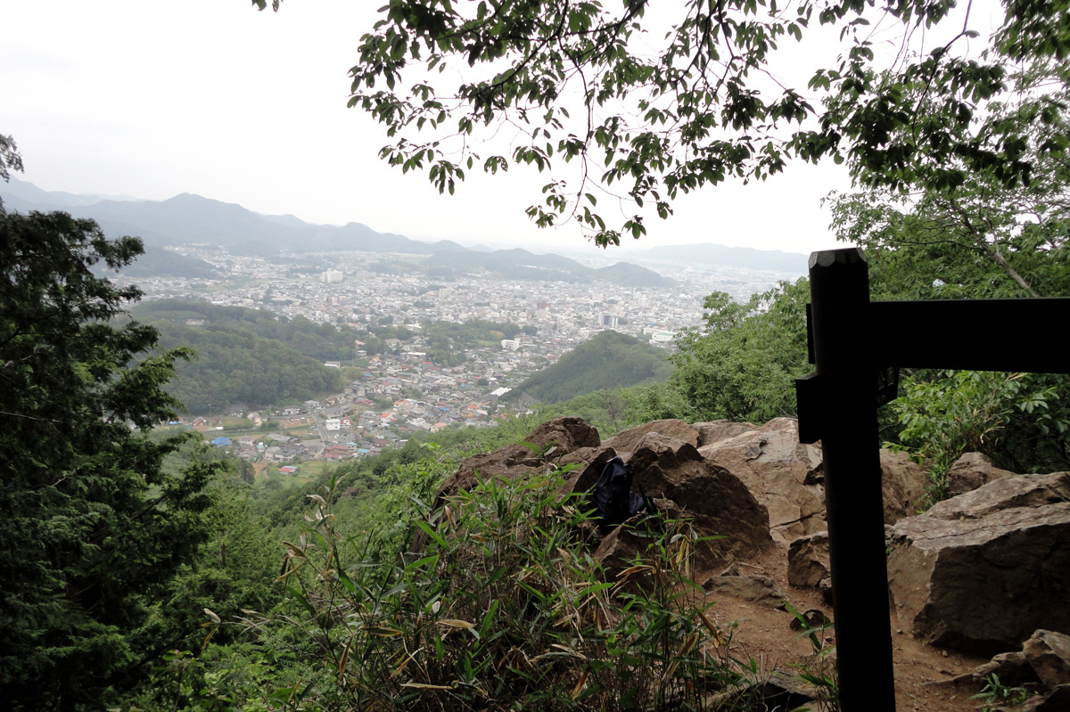 | 【9:54】 トンビ岩 急な坂をひと登りしての休憩ポイントです。 大きな岩の正面には、視界を邪魔する木は無く桐生市街地を見渡す事が出来ます。いきなりの急登で息を乱した後なので、一休みする丁度良い場所です。 ここで息を整えた後は、再び急登が続きます。 |