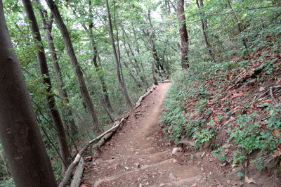 トンビ岩から再び急な坂を登り詰めると、一旦道は平坦になります。歩きながら息を整えられるので、丁度良い感じです。この辺がたぶん中間地点位になるのではないでしょうか。 |