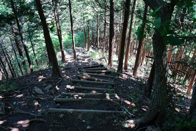 | 【10:45】 下山開始 女吾妻山からの下りは緩やかなのですが、吾妻山への登り返しは急な階段が長く続き苦労します。 【10:55】 吾妻山山頂通過 急階段を登り切り吾妻山の山頂を通過します。 関東ふれあいの道と書かれた石標の所を右に入り下山開始です。まずは斜めに下る真っ直ぐな道は、勢いが付くので滑らない様に注意が必要です。登ってくる時は気付かなかったのですが、このコースで唯一赤城山が見えるのがこの辺でした。それも葉の隙間から少し見える程度です。 【11:20】 東禅寺へ無事帰還 吾妻山から下山を開始して約25分、東禅寺の屋根が見えて来るとすぐ登山口に到着です。その後は東禅寺の本堂と梵鐘を見てから駐車場に戻りました。 |