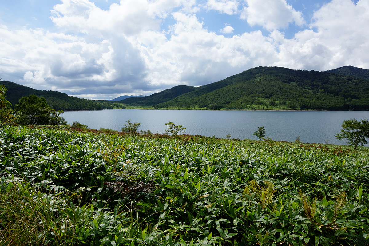 湖東側の遊歩道は殆どの所で水際まで行く事が出来ません。富士見峠近くまで行くと、下に降りる道があったので行ってみました。野反湖の水は濁りの無く綺麗です。でもこの日は風が少しあった為波が立っていて、向い側の景色を移す事はありませんでした。 |