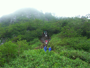 【ひとこと】 標高差約800mを7Kmもかけて登ります。物凄い急登はありませんが道のりが長く、それが辛く感じました。泥沼の様になった登山道が何箇所もあるのには、苦労させられました。 |