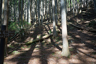 | 【8:38】 大蔵山と五輪山の分岐 登山口から10分弱で分岐に着きます。伊豆ヶ岳まで最短ルートで行くには直進の五輪山コースですが、かめ岩を見てみたいと思ったので遠回りして右へ登る大蔵山コースへ進みました。 ここからは今までとは違い傾斜がキツクなり、本格的に登山が始まるなという感じです。15分程登ると大きな亀の甲羅の様なかめ岩が現れます。かめ岩から10分弱で稜線に出たので大蔵山かなと思ったのですが、まだ手前の小さな尾根でした。ここからはやや急な長い登り坂が続きます。 【9:10】 大蔵山 長い坂を登り切ると大蔵山に到着です。杉林の中なので周りは何も見えません。少し休んでから再スタートです。ここからは主稜線歩きで、すぐに大蔵山の迂回ルートと合流します。最初は楽な稜線でしたが、次第に傾斜がキツクなり最後は長い丸太の急階段を我慢して登ります。 【9:28】 五輪山 大蔵山の山頂は木の根が張り出した所でしたが、五輪山の山頂は平に整備された広い場所です。展望は残念ながらここでもありません。 |