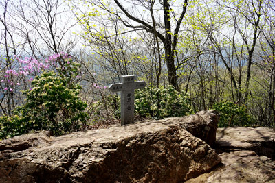 | 五輪山の目の前に見えるのが目的地の伊豆ヶ岳です。五輪山から一旦下り切った所に男坂と女坂の分岐があります。直進が巨大な岩を登る男坂ですが、落石注意の看板とロープが張られており女坂を利用してくださいと書かれています。息子は折角なので男坂を行くと言っていますが、私は腰がまだ不安なので女坂へ進みました。女坂と言っても一気に約80m登るので傾斜はキツク、特に山頂直下の急登は苦労しました。 【9:45】 伊豆ヶ岳 伊豆ヶ岳の山頂は稜線上なので細長くなっています。でも広い場所もあり多くの人が休む事が出来ます。伊豆ヶ岳の最高地点は木の看板の所ではなく、その少し先の岩でした。この辺でザックを下ろして休憩です。山頂の周りも細い木で覆われているので、綺麗な眺望はありません。木の間から景色が見えても、この日は霞んでいて遠方は見えませんでした。山頂の周りには所々アカヤシオが綺麗に咲いています。地面には花びらが散っていたので、少し前まではヤマザクラが咲いていた様です。 |
