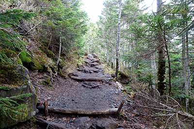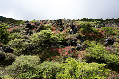 横岳神社から坪庭の散策路に戻ります。丁度その時、先程の中学生の団体と遭遇しました。木道の上で止まっていたので「どうしようかな」と思っていたら、全員片側に避けて通してくれました。多分その様な指導を受けていたのだと思います。 坪庭は溶岩台地の上に広がっており、通常は森林限界(2500m以上)より上で育つハイマツが、2200mの場所で植生するという不思議な場所らしいです。緑のハイマツの中に紅葉したクロマメノキが綺麗に映えています。 散策路をしばらく進むと、分岐が現れます。ここが北横岳の登山口になっており、右が散策路の周遊コースで左が北横岳への登山道です。ここからの登山道も、今までの散策路と同じ様な道が少し続きます。正面には北横岳の斜面に縞枯れ(横縞状に木が枯れる現象)が見られます。 登山道を進むと下り坂になり、徐々に登山道らしくなってきました。 |