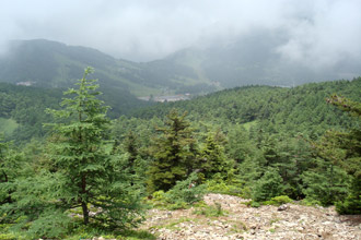 鞍部から10分程登ると、樹林帯の中から突然開けた所に出ます。丁度いいのでここで一休み。後を振り返ると登山口の高峰高原ホテルや籠ノ登山が見えます。本当ならば遠くに北アルプスの山並みを見ることが出来るはずなのですが、この日は曇っていて見えませんでした。 |
