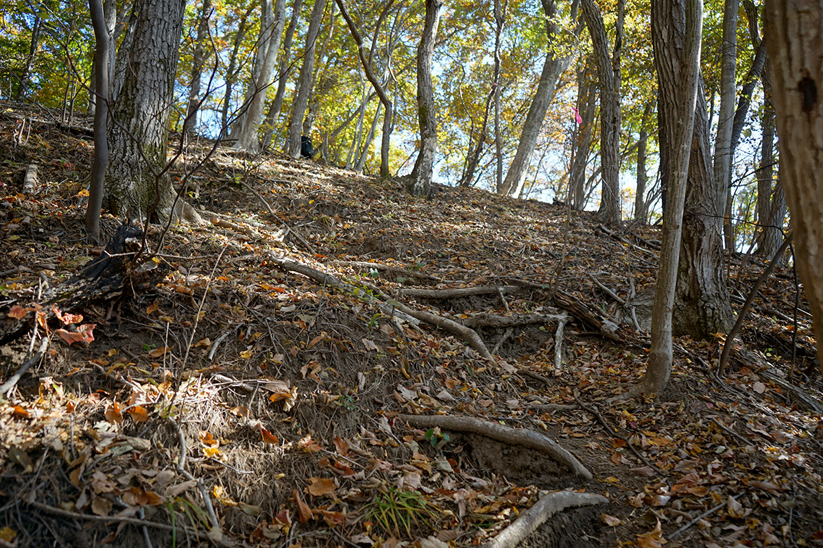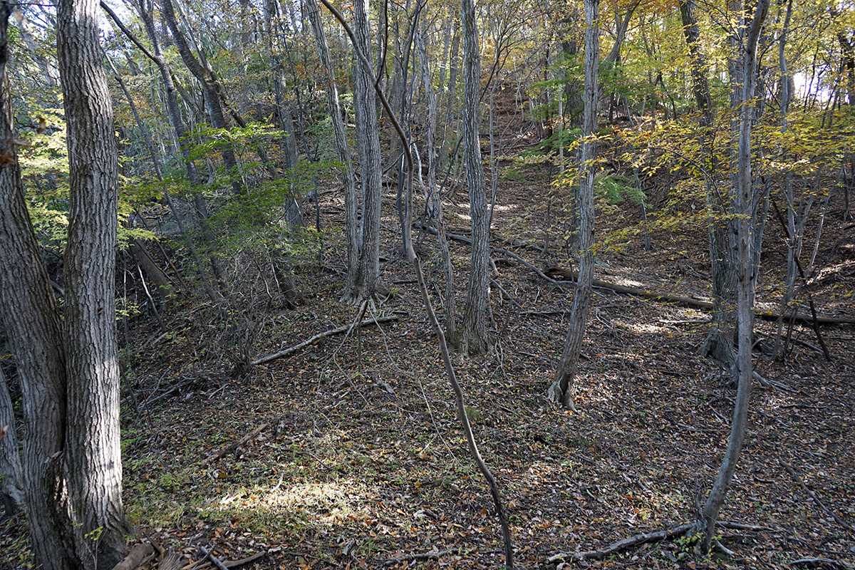 【9:38】 ジジ岩・ババ岩の分岐 展望岩から分岐に戻って、いよいよ山頂へ向かいます。ここから少し登れば稜線なのですが、そこまでの道が落葉に隠れて少し分かり辛いです。ここでもリボンを頼りに登ります。 稜線は少し傾斜が増し、細い尾根道になっていたりします。何度かアップダウンを繰り返すと高石峠分岐に出ます。 【9:50】 高石峠分岐 ここからが最後で最大の急登が始まります。それに加え登山道が滑りやすくなっている場所もあるので苦労します。でもその様な所にはロープが設置してあるので助けになりました。 我慢しながら急登を一歩づつ登ると、やがて傾斜は緩くなり先には山頂らしき所が見えて来ました。 |