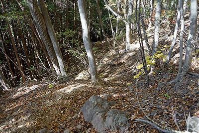 【7:40】 本宿分岐の駐車スペース 下仁田町中心部から長野方面に約8Km行った所の、本宿への分岐に駐車スペースはあります。2ヶ所に分かれて合計10台以上は駐車出来ますが、まだ1台も止まっていませんでした。 駐車場スペースから国道を少し戻ると西牧関所跡があり、その先が登山口への入口です。 【7:44】 御堂山登山口 国道から100m位入った所に登山口はあります。電流が流れているのか分かりませんが、「危険さわるな!」の札が下がっている柵があるので、これを跨いで登山を開始します。 最初は緩やかな傾斜の林道歩きが続き、準備運動にはちょうど良い感じです。途中林道が崩壊していたり、元の橋が壊れて丸太の一本橋が架けられている所があります。この一本橋は現在渡れないので下を迂回します。この先林道が終わり登山道に変わっても、水の流れで削れてしまったり、大きな石がゴロゴロしていたりして歩きづらい道が続きます。 |