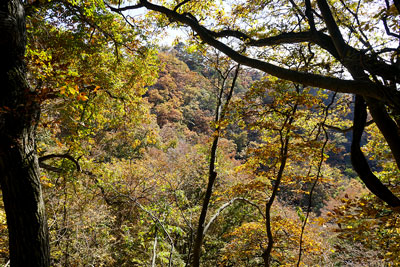 【ひとこと】 もう何回も登山口の前は通ていて、いつかは登ろうと思っていた山にやっと登る事が出来ました。紅葉が綺麗だという事で秋を選んで登りましたが、思っていた程綺麗な色にはなっていませんでした。 登山道は全て樹林帯の中で、山頂を含め展望の良い所はありません。唯一良い所は山頂への登山道からは外れたジジ岩・ババ岩の展望台です。往復で20分位ですが、絶対に行ってみるべき御堂山の名物です。 | |