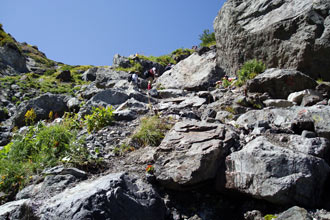 小蓮華山からの展望もまた素晴らしいです。大雪渓も良く見える様になり、昨日休んだ白馬尻小屋も見えています。そしてここに来て初めて白馬大池が見えてきました。まだまだ遠くその道のりは長いようです。 【9:05】 白馬大池に向けて出発 |