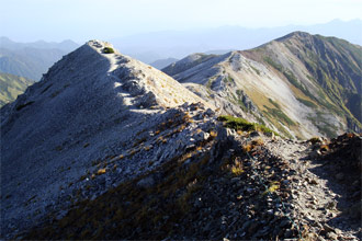 三国境から少し下り坂が続きます。尾根の道もそれ程細くなく快適に縦走を楽しむことが出来ます。 【8:45】 小蓮華山到着 |